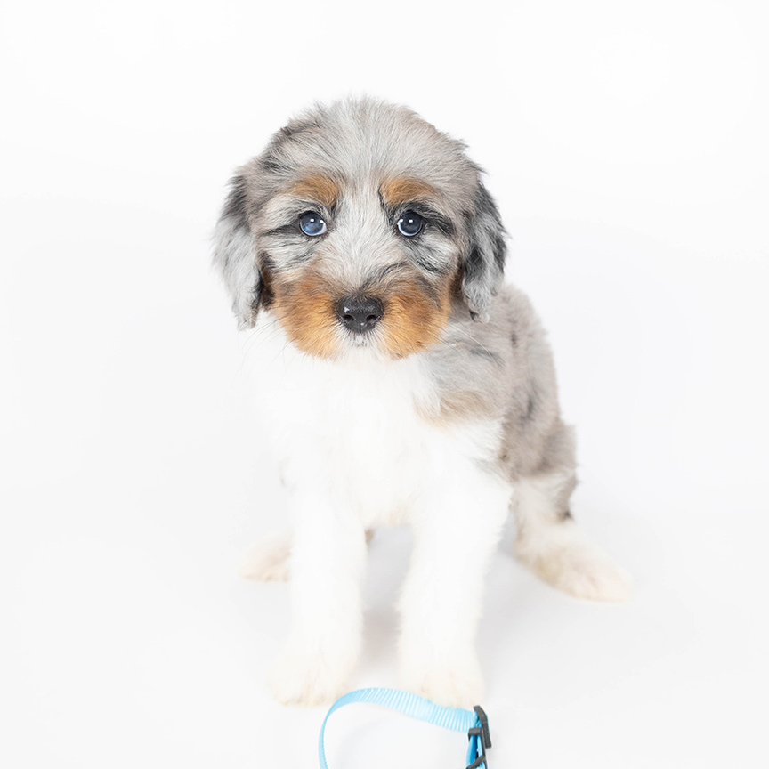 Bernedoodle puppies may be born with striking blue or gray eyes, which often darken to brown as they grow. Occasionally, some Bernedoodles retain lighter eye colors into adulthood, giving them a unique and captivating look.