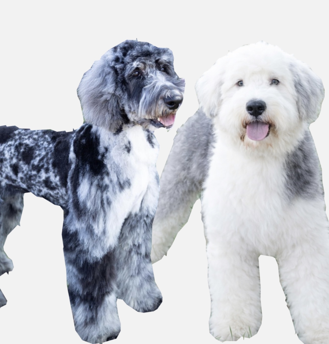 Sheepadoodles come in F1 (50% Old English Sheepdog, 50% Poodle), F1B (25% Old English Sheepdog, 75% Poodle), F2 (F1 x F1), and F2B (F1 x F1B) generations.